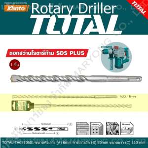 Total ดอกสว่าน โรตารี่ก้าน SDS PLUS สำหรับ เครื่องสว่านโรตารี่ TOTAL-TAC310601 ขนาดหัวเจาะ (A) 6mm การเจาะลึก (B) 50mm ขนาดยาว (C) 110 mm หัวเจาะนำศูนย์ เจาะตรงจุด ไม่ลื่นไหล แม่นยำ 1 ชิ้น (Code 1N-01) ซื้อทางแอพและเว็บออนไลน์ มั่นใจได้ในความปลอดภัย มีเก็บเงินปลายทาง จัดส่งถึงมือแน่นอน