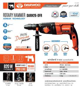 DAEWOO สว่านโรตารี่ 3 ระบบ (รุ่นถอดเปลี่ยนหัวได้) 820 วัตต์ 26 mm.รุ่น DARH26-DFR มีส่วนลด มีส่วนลดราคาประหยัดที่สุด